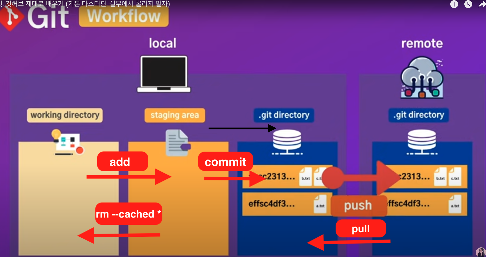 - staging area : 어느 정도 준비가 된 파일을 저장하는 곳 (git add)